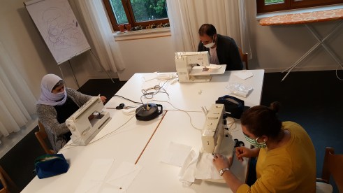 Die Stoffe wurden hauptsächlich gespendet, Anschaffungen fürs Material übernimmt das Projekt Passerelle. Morad unterstützt die Frauen als Experte beim Nähen mit seinen professionellen Anweisungen und Hilfestellungen. Es ist eine Win-Win Situation für alle Beteiligten“, freut sich Svenja. „So lernen die Frauen Neues dazu, Morad kann seine Idee schnell in die Tat umsetzen und die Menschen in den Unterkünften bekommen tolle und günstige Masken!“
