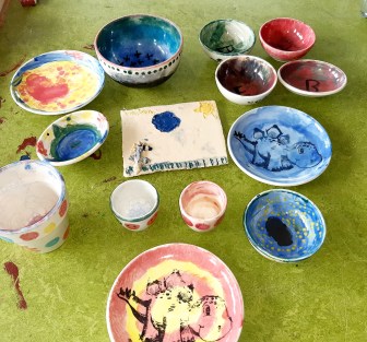 Mit der Einrichtung und dem Aufbau der Keramikwerkstatt geht es jetzt stetig voran. Vor allem in der Exit-Gruppe und in der Kinderwerkstatt haben wir immer wieder mit der Aufbautechnik oder figürlich getont. Jetzt kamen noch Farbe und Glasur hinzu.