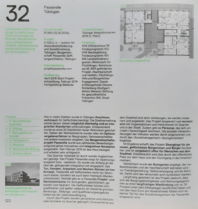 In der Broschüre des Ministeriums heißt es zum Beispiel: Im urbanen Kontext „treten vermehrt Initiativen (…) auf, die sich abseits formeller Planungs- und Beteiligungsmodelle, mit konkreten Projekten für ihre Stadt engagieren und so eine zunehmend wichtige Rolle in der Stadtentwicklung einnehmen (…) Beispielhaft zeigt dies das Baugemeinschaftsprojekt Passerelle in der Tübinger Südstadt, das sich als stadtteilbezogenes Wohn-, Aktions- und Gesundheitsprojekt für geflüchtete und nicht geflüchtete Menschen versteht und als zivilgesellschaftlicher Akteur die Stadt insgesamt bereichert.“ (S. 79)