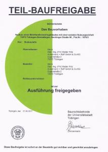 Nach der Baugenehmigung ist nun auch die Teil-Baufreigabe eingetroffen. Der Grund dafür, dass der grüne Punkt noch nicht ganz rund erteilt wurde, ist die Prüfstatik, die noch nicht so weit ist. Bis zur Bodenplatte dürfen wir schonmal bauen. Jetzt kann es richtig und legal losgehen mit unserer Baustelle.